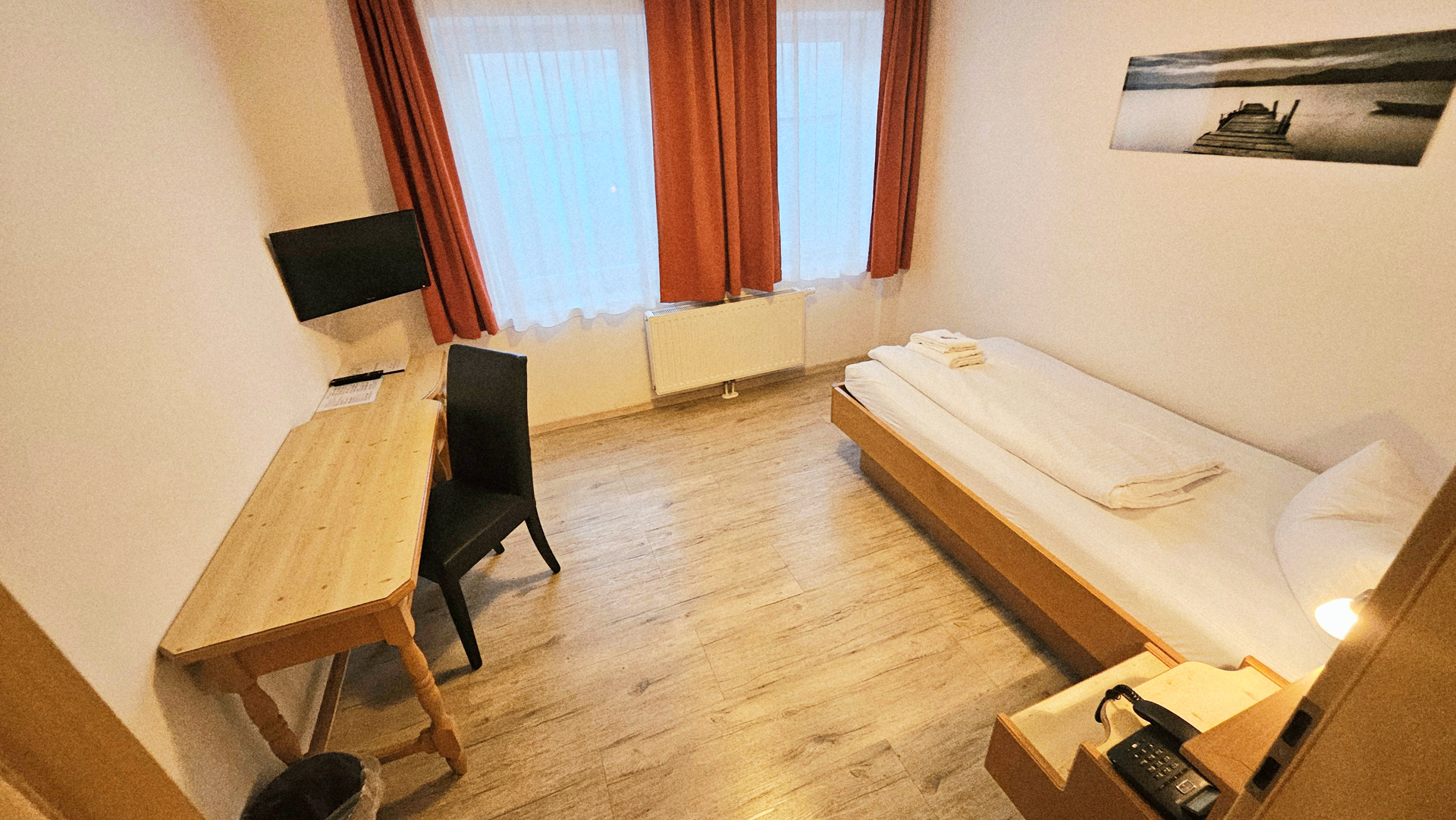 Unsere gemütlichen Einzelzimmer sind mit einem Einzelbett ausgestattet und bieten alles, was man für einen angenehmen Aufenthalt braucht: ein eigenes Badezimmer mit Dusche, WC, kostenfreie Pflegeartikel und einen Föhn, sowie TV und einen kleinen Schreibtisch. Ideal für Geschäftsreisende oder Alleinreisende, die zentral in Königsbrunn übernachten möchten. Die klassische Standardausstattung sorgt dafür, dass Sie sich vom ersten Moment an wohlfühlen - kompakt, praktisch und genau richtig für eine erholsame Nacht im Hotel Krone.